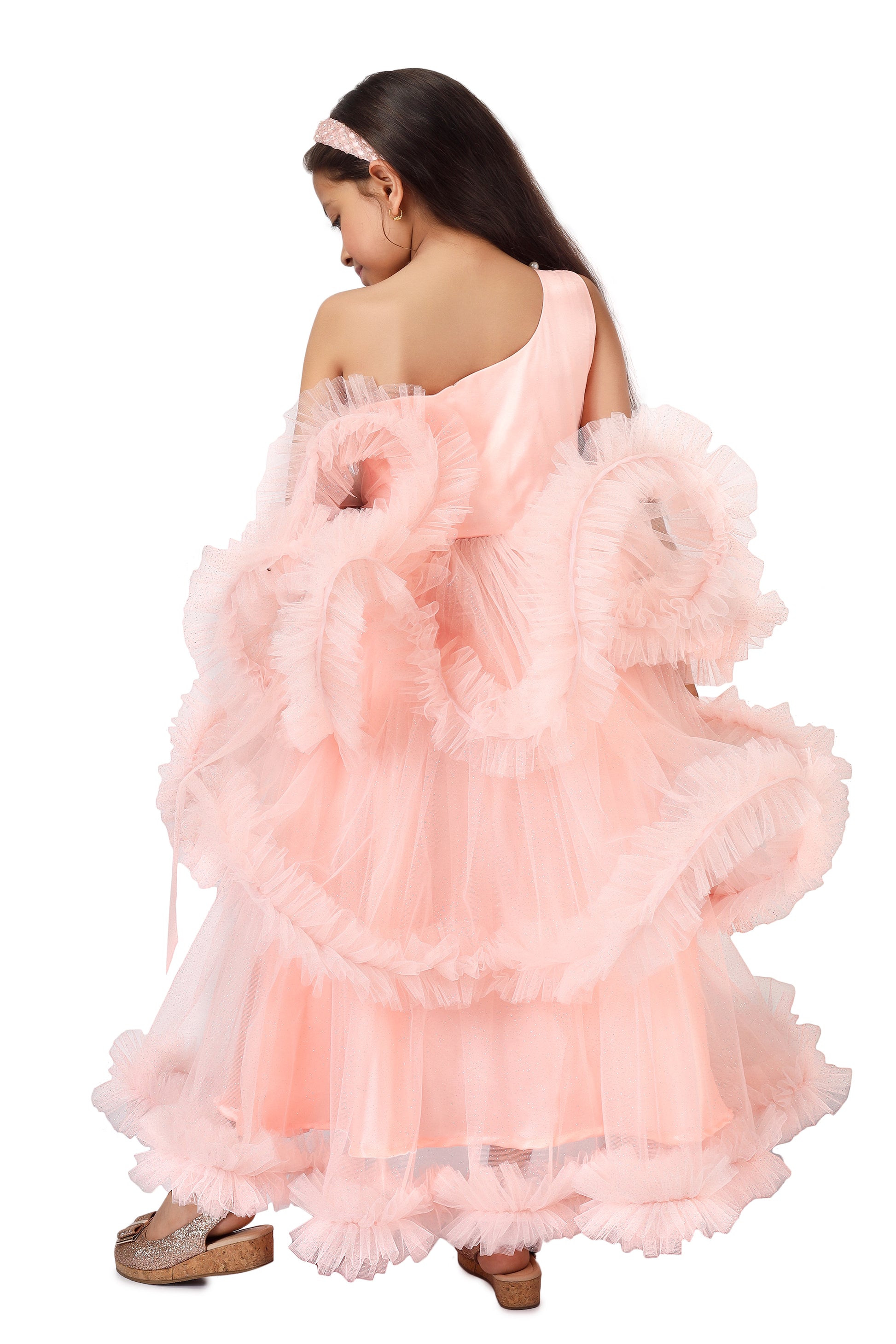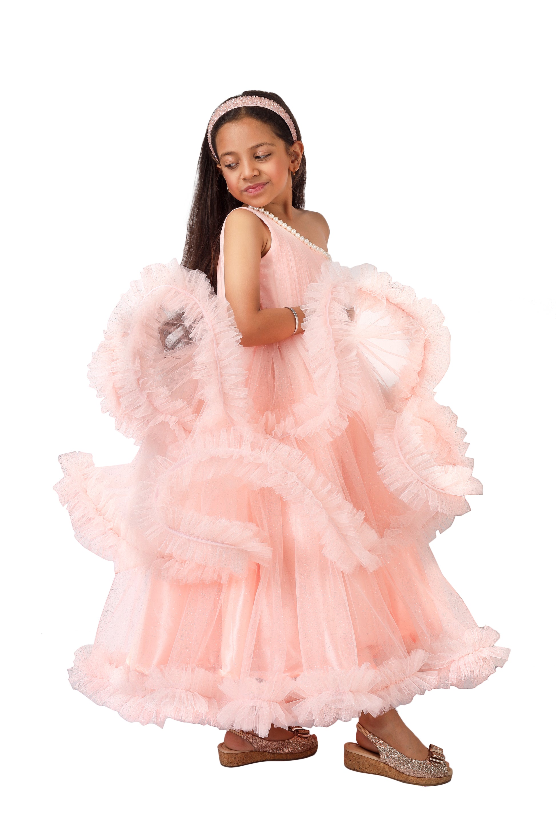 - Peach color extra flared party wear long gown with pearls