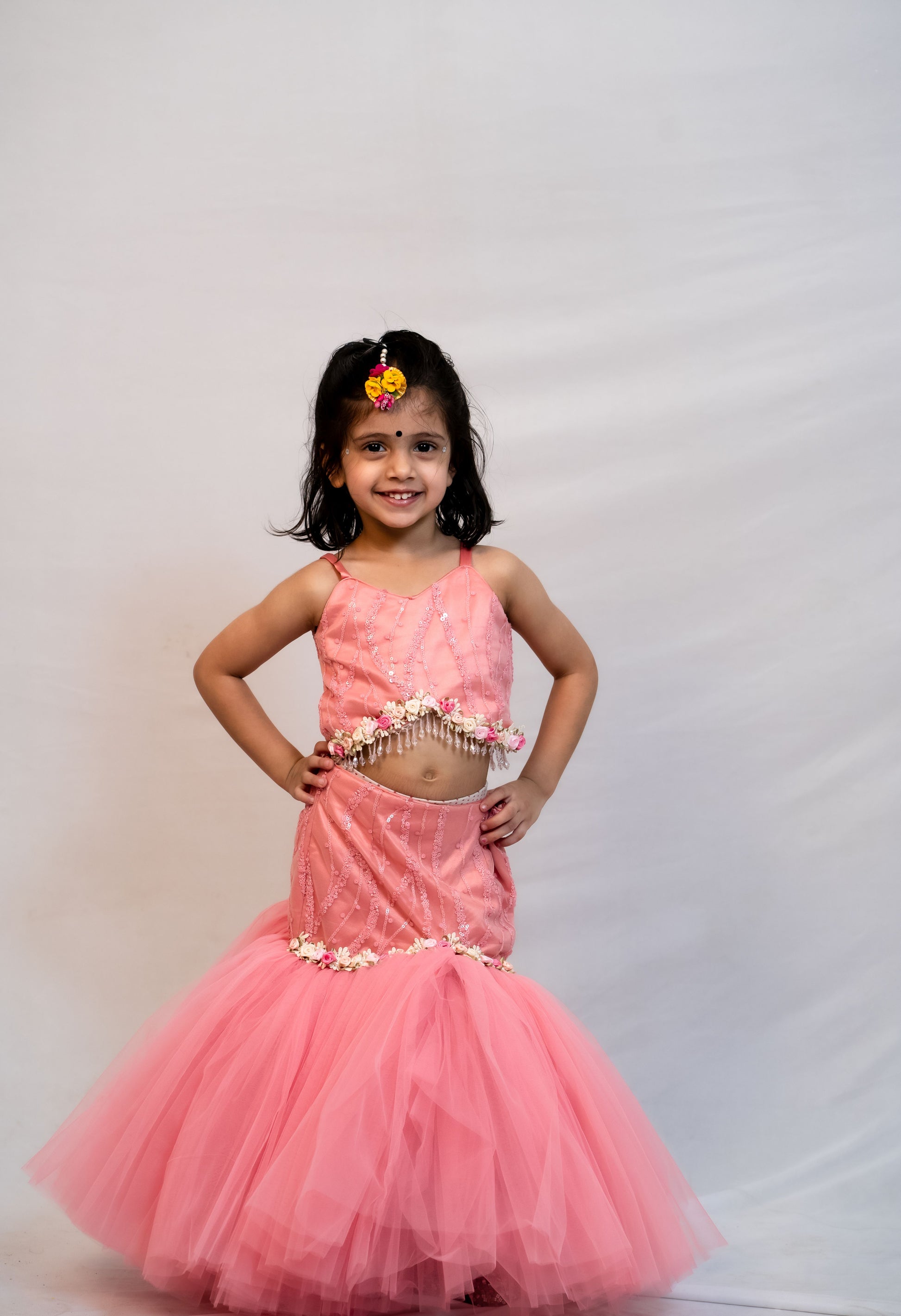 * Peach sequine and Net fish cut lehenga